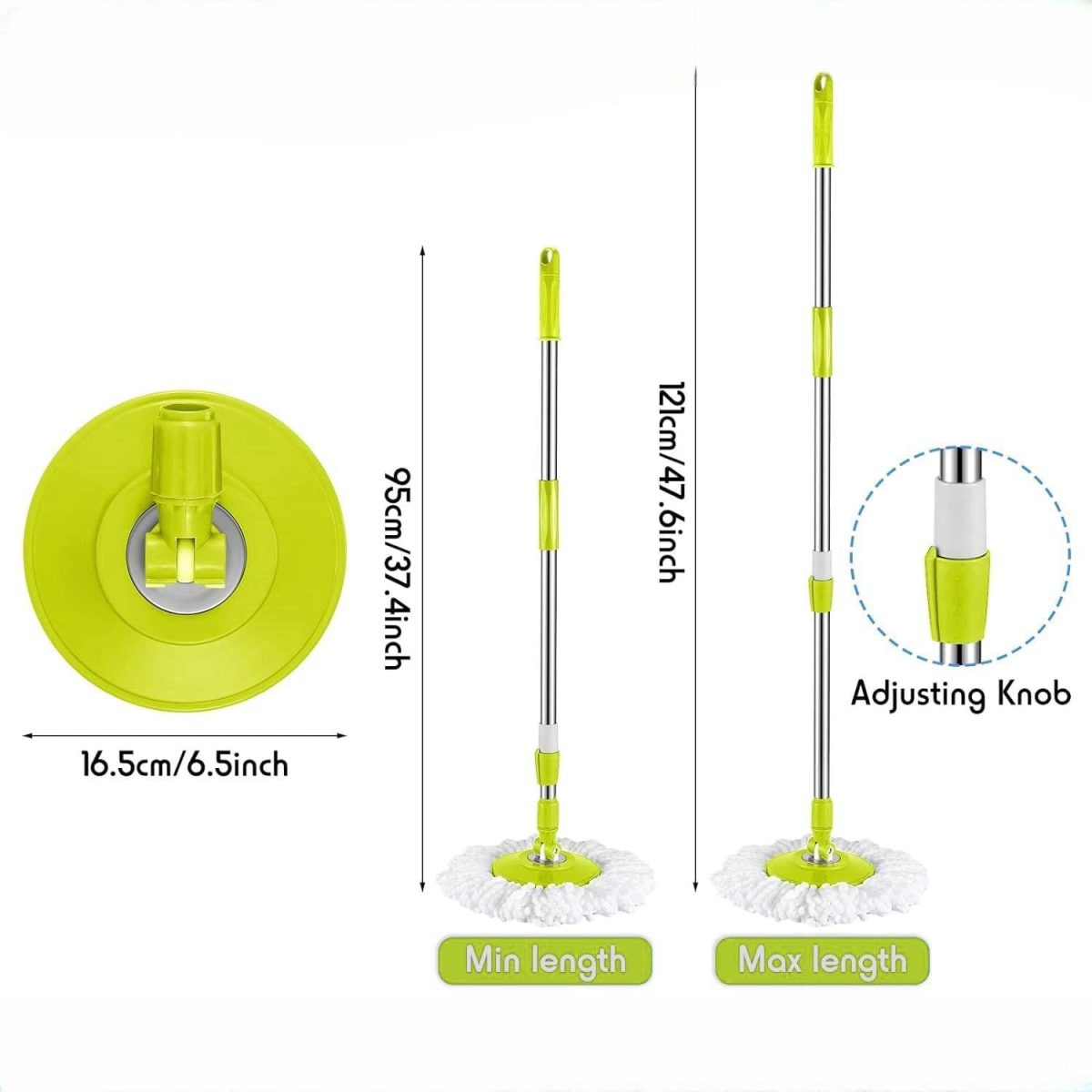 - Suitable Sizes: The spin mop pole replacement has an outer diameter of 6.5 inches/16.5 cm and inner diameter of 6.3 inches/16 cm. Fully extended it is 47.6 inches/121 cm. Fits most spin mops including 364 degree spin round mop